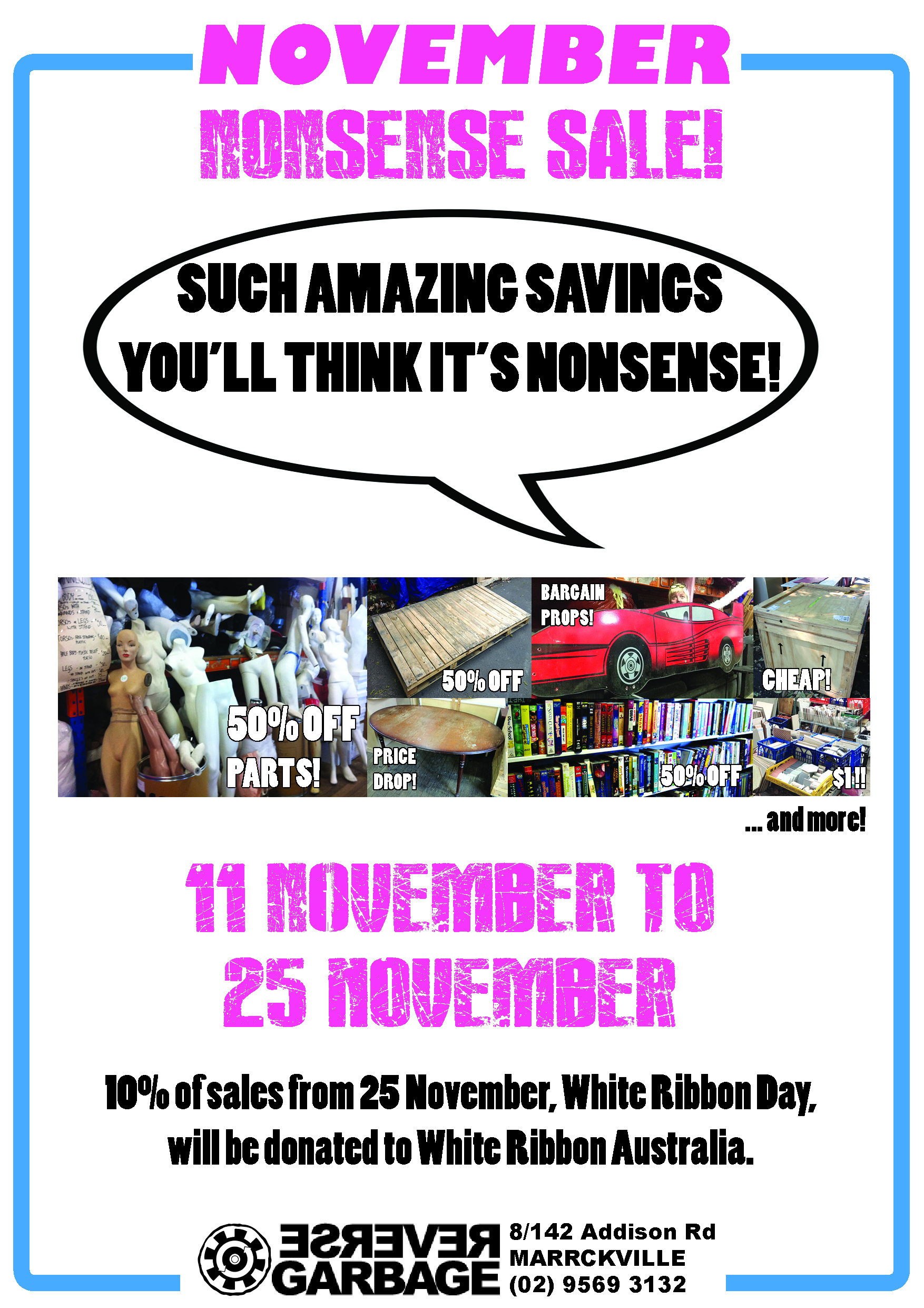 Sale stars 11 November to 25 November 2013. 10% of proceeds from sales on White Ribbon Day will be donated to White Ribbon Australia to stop domestic violence – www.whiteribbonday.org.au