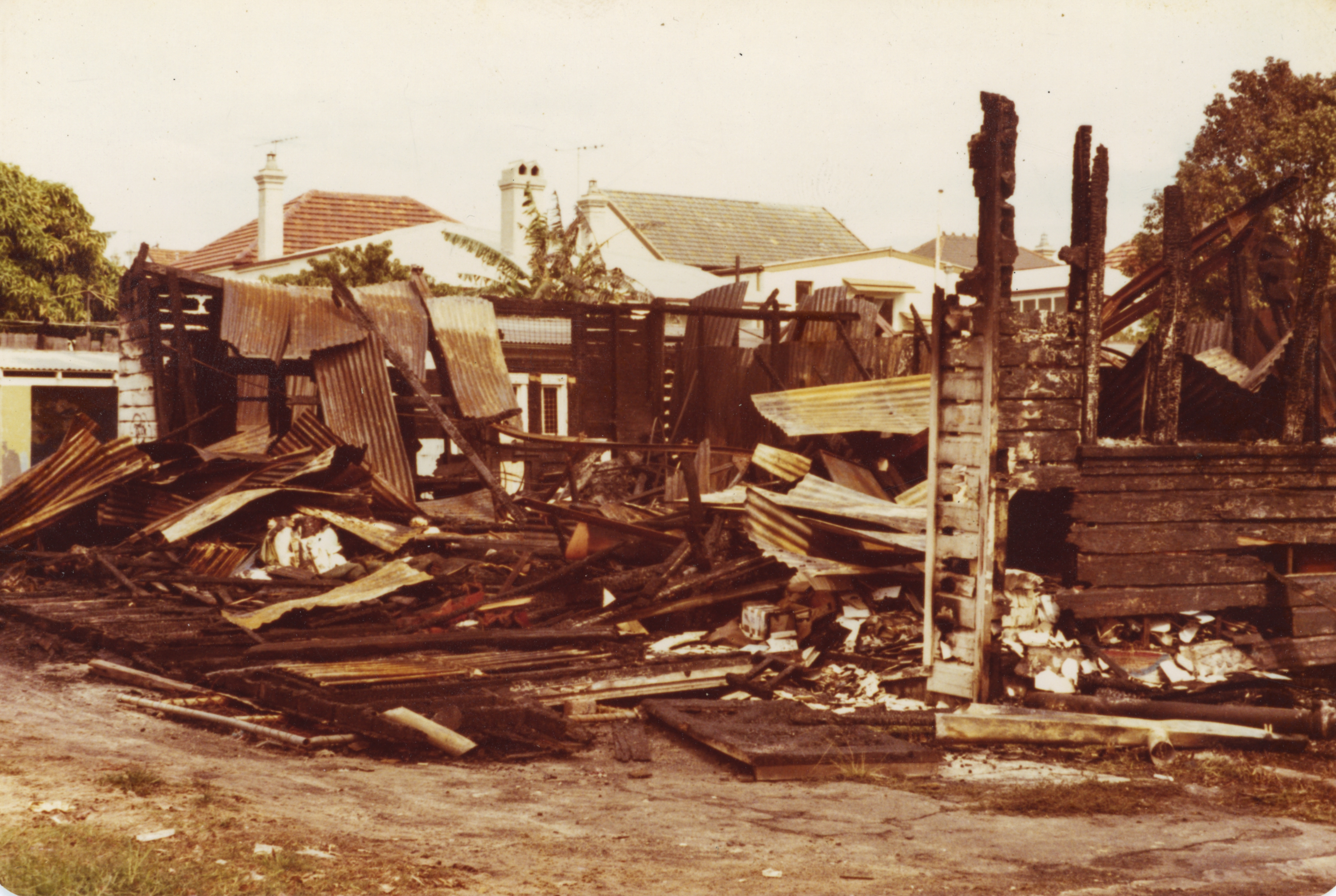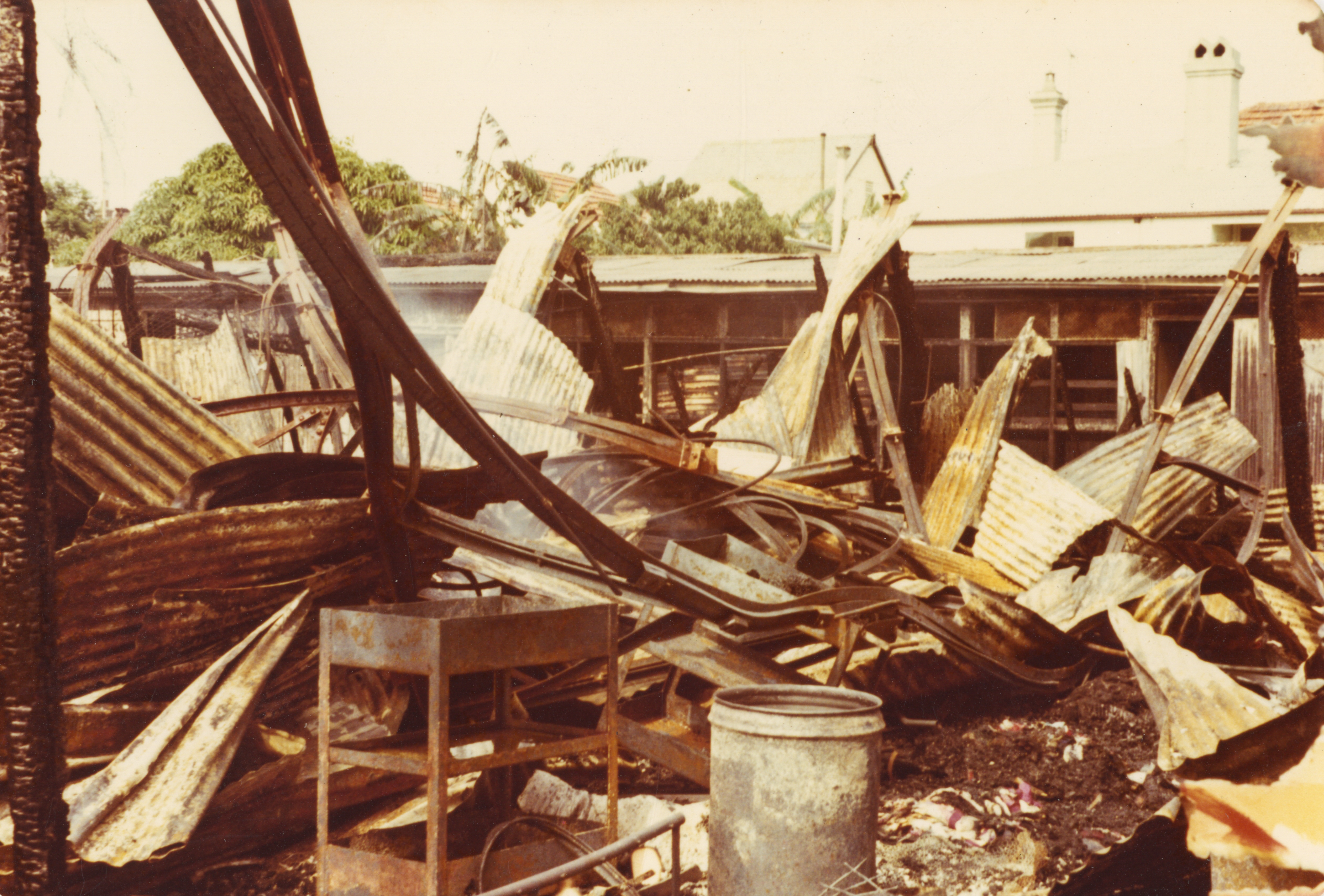 The most catastrophic thing that has happened in the 50 year life of Reverse Garbage occurred once we had moved to Addison Road and had been operating there successfully for a number of years. The warehouse that we occupied was burnt to the ground. Someone had broken a window of the room where all the flammable liquids were stored separately and thrown in matches. The day of the fire I was driving home to the Inner West when I saw a pall of smoke rising on the horizon. The closer I got to this column of grey smoke the more worried I became only to have this dread confirmed as I turned into Addison Road to see what was now the smoking ruin of Reverse Garbage. Everything was gone. The building, a warehouse full of useful resources, all of our records and all the spaces we had created inside that building. Everything had gone up in smoke.