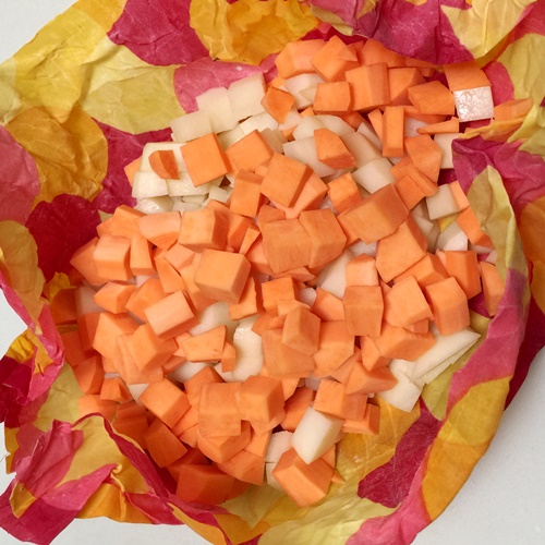 - Wrapping prepped veg that might oxidise quickly, like sweet potato (photo shows them after half an hour, but sweet potato usually goes black on me as soon as it’s cut!)